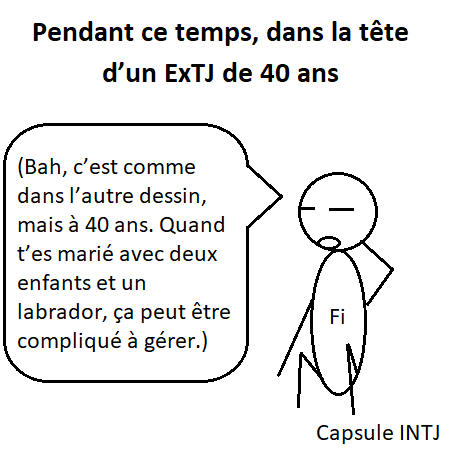 C’est ainsi que les TJ accomplissent l’exploit d’avoir l’air sûrs d’eux alors qu’ils ne savent pratiquement rien d’eux. Ils ont certes quelques passions conscientes (comme la fameuse « faiblesse inavouée pour les trucs mignons qui les transforme instantanément en guimauve, à la grande surprise de ceux qui les croyaient insensibles ») et savent parfois donner l’illusion de capacités auto-analytiques très avancées… mais la connexion authentique avec soi n’y est pas. Ils pensent leurs émotions, planifient leurs sentiments, s’élancent sur un parcours tout tracé sans songer à s’arrêter par moments et se demander « Et là, est-ce que ça va ? »… Jusqu’au moment où ils réalisent qu’ils ont oublié quelque chose de primordial sur la ligne de départ, désormais loin derrière eux. Très loin s’il s’agit d’un ExTJ, car il a besoin de beaucoup plus de temps qu’un IxTJ afin de conscientiser Fi. (Jeunes adultes, les ExTJ sont déjà occupés à gérer l’équilibre de leur axe S/N.)